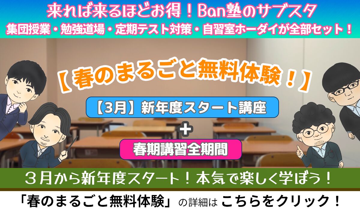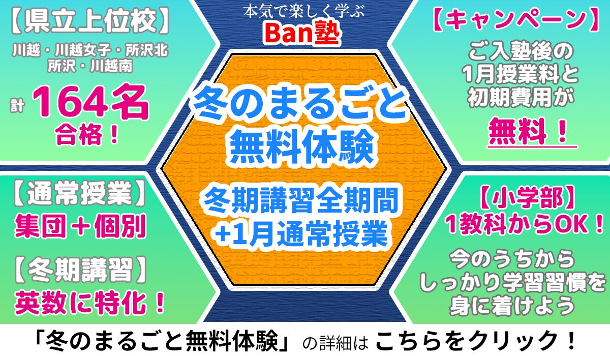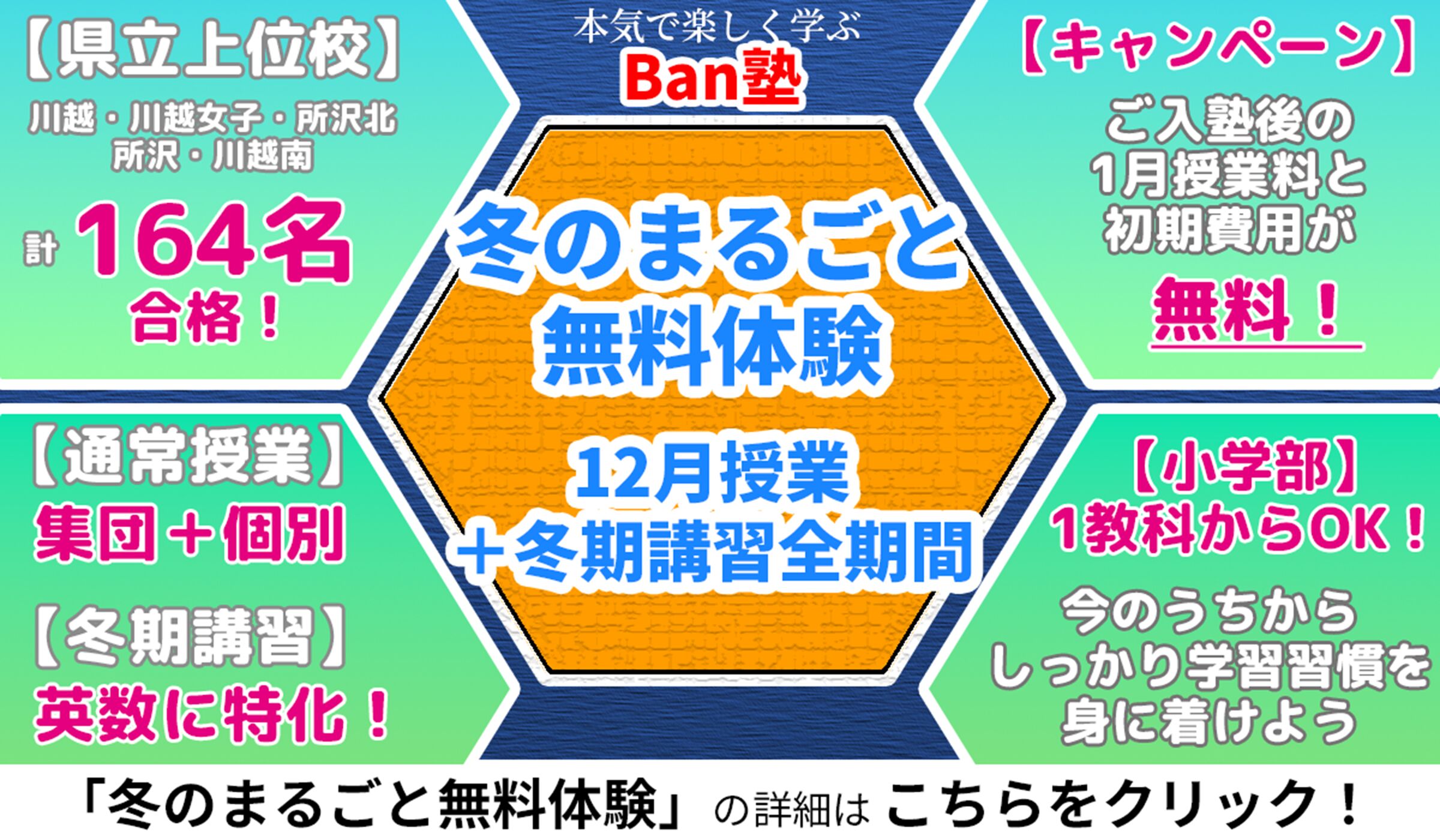 2022.09.102025.09.23 【特設ページ】 ≪ Ban塾の特徴 ≫ 中学部 中3・中2・中1 集団授業+個別学習サポートでコストパフォーマンス抜群! 充実の定期テスト対策! 先取り授業で安心! 小学部 小6・小5・小4 1教科から受講可能!算数・英語・国語 先取り授業だから安心! コストパフォーマンス抜群! 充実のサポート 欠席時のフォローが充実! リモート対応! 兄弟姉妹割引や同時入塾割引! 実績 飯能で27年間の実績! 定期テスト結果! 卒業生の声も掲載中!