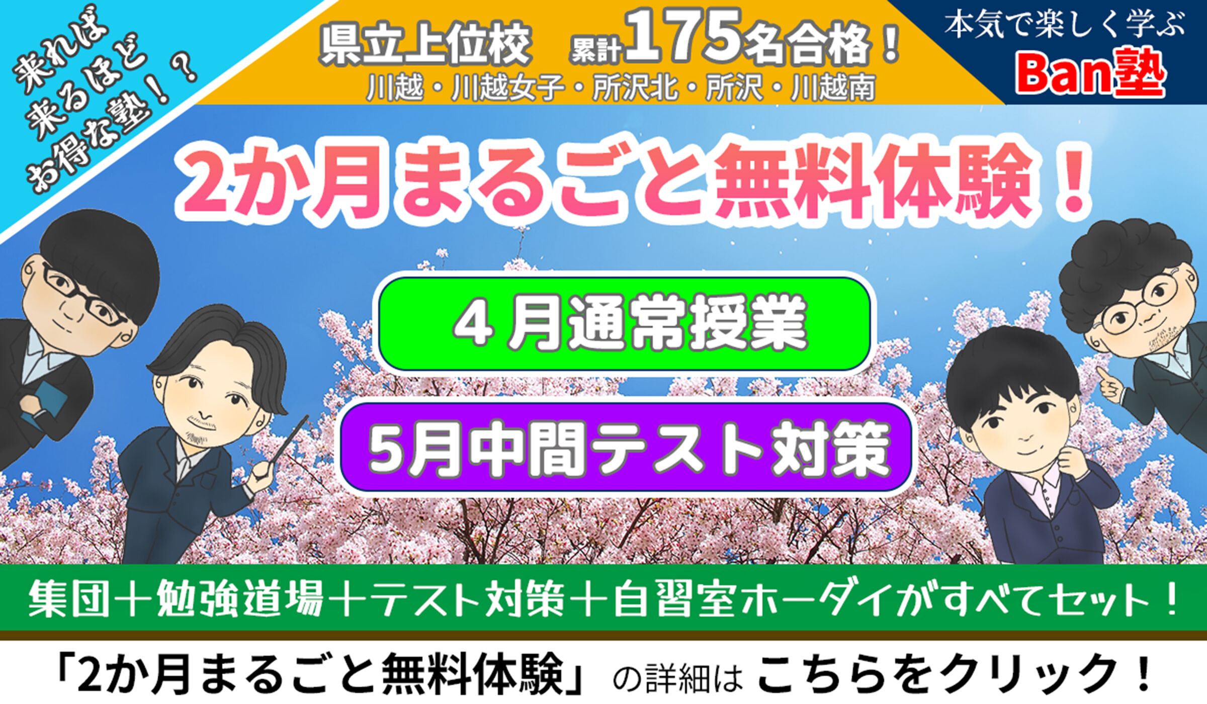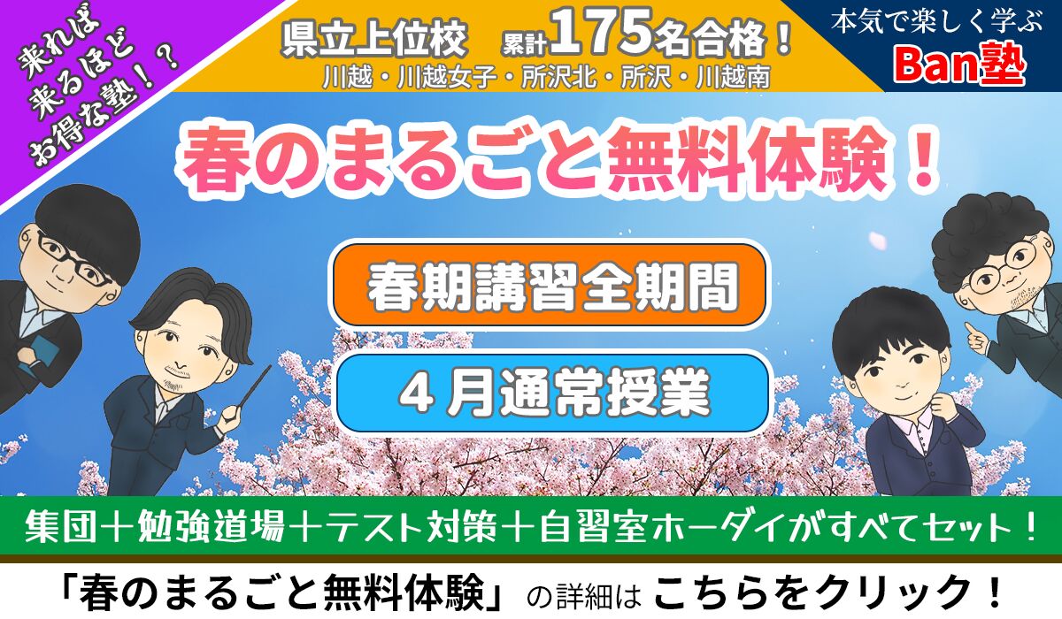 2022.09.102026.03.06 【特設ページ】 ≪ Ban塾の特徴 ≫ 中学部 中3・中2・中1 集団授業+勉強道場+定期テスト対策+自習室ホーダイがすべてセット! 充実の定期テスト対策! 先取り授業で安心! 小学部 小6・小5・小4 1教科から受講可能!算数・英語・国語 先取り授業だから安心! コストパフォーマンス抜群! 充実のサポート 欠席時のフォローが充実! リモート対応! 兄弟姉妹割引や同時入塾割引! 実績 飯能で28年間の実績! 県立上位校計164名輩出 卒業生の声も掲載中!