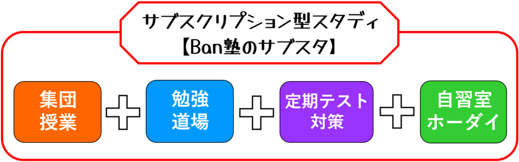 より良い学習には質の高い授業だけでなく、演習量を確保することが肝要です。そこで、Ban塾では下記の集団授業・勉強道場・定期テスト対策・自習室ホーダイすべてがワンパックになったサブスクリプション型学習【サブスタ】を採用しております。
